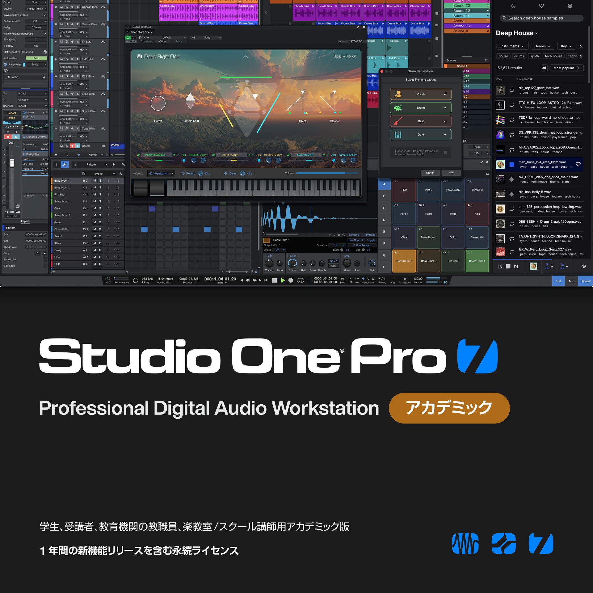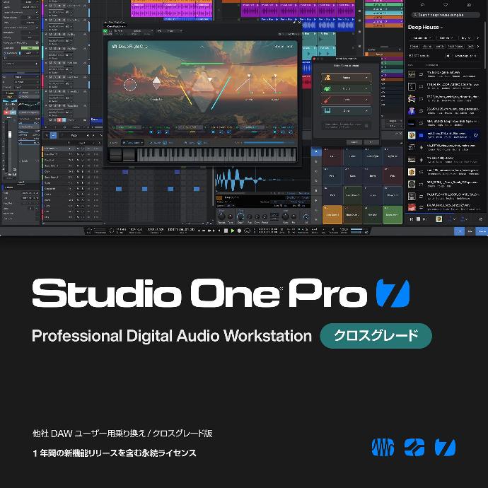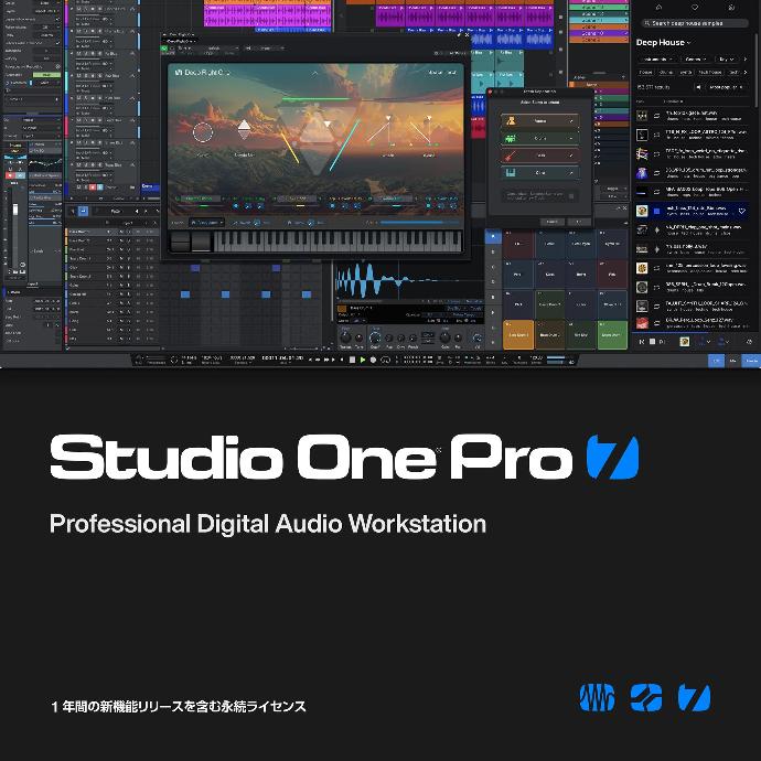 Studio One Pro 7は、レコーディング、プロダクション、ミキシング、マスタリング、パフォーマンスに必要な全てを包括的に提供するパワフルなオールインワンDAWソフトウェアです。高速で直感的な編集とミキシング、統合されたパターン・ワークフロー、ドラムのタイムアライメント、数々の賞に輝くスコアリング、シームレスなマスタリング、安定性に優れたライブ・パフォーマンス、先駆的なドラッグ&ドロップ・ワークフローなどによりクリエイティブな音楽制作とパフォーマンスの新たな基準を打ち立てます。