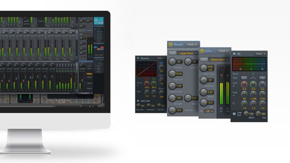 3バンド・パラメトリックEQ、ロー・カット、コンプレッサー、オートレベル、MS処理、位相反転などの効果をチャンネルごとに設定できます。リバーブ / エコーのエフェクト機能は、ステレオのセンド / リターン・バスによりすべてのチャンネルに提供され、これらエフェクトは192kHzを含むすべてのサンプル・レートでご使用いただけます。