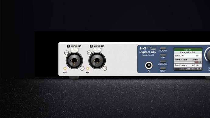 RMEのメイン入力はNeutrik社製のXLRコンボ仕様のマイク / ライン・プリアンプを採用。デジタル制御された2つのプリアンプは、個別に切替可能な48Vファンタム電源を供給可能です。