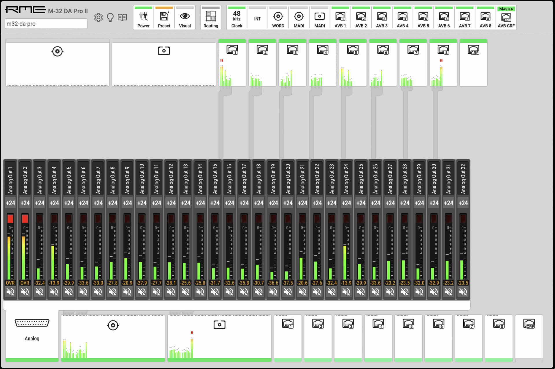 ルーティング・マトリックスにより、すべてのアナログおよびデジタル入出力間でのシングル・チャンネル・ルーティングが可能です。チャンネル単位で柔軟にルーティング可能なこのマトリックス機能によって、M-32 Pro IIは、アナログ、MADI、AVBのデジタル・パッチベイとしても機能し、オーディオ信号やクロッキング、接続などを分かり易く確認しながら、トラブル・シューティングも迅速に行えます。
