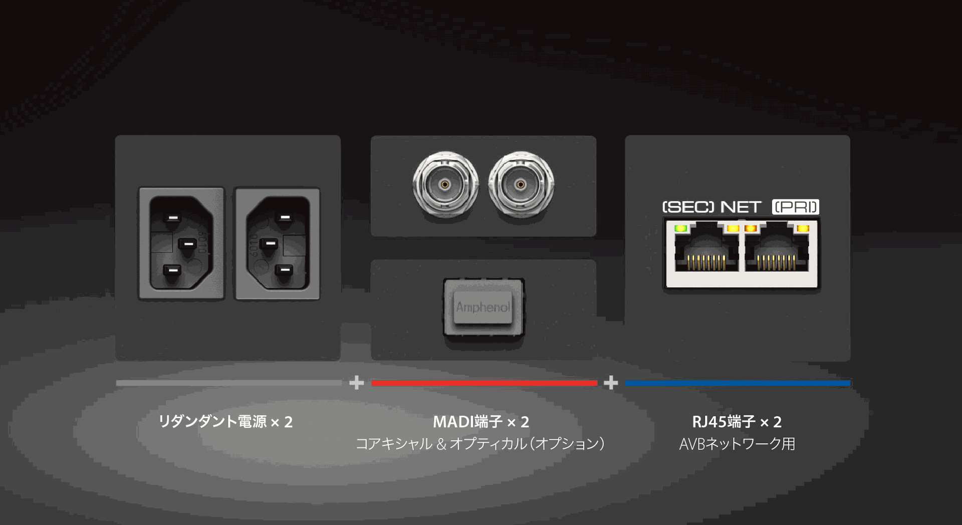 • 最大288入力 × 256出力(​​アナログ × 32、MADIオプティカル × 64(オプション)、MADIコアキシャル × 64、AVB × 128)