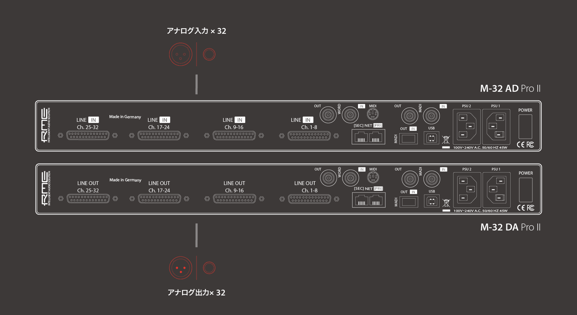 • アナログ入力 × 32チャンネル(D-sub 25ピン、最大 +24 dBu)