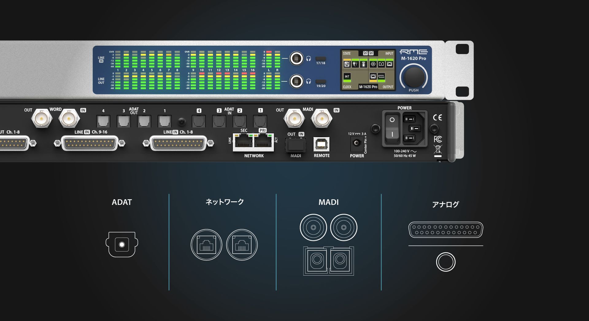 M-1620 Proは、ADAT、AVB/Milanネットワーク(ギガビット・イーサネット対応)、MADI(コアキシャル、およびオプションのSFPモジュールによるオプティカル)、さらにアナログの各入出力を備え、デジタルとアナログの信号をこの1台でシームレスに統合します。