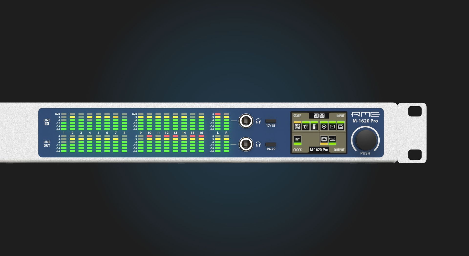 M-1620 Proは、プロフェッショナル環境に求められる高音質と柔軟な入出力設定を兼ね備え、各16チャンネルのアナログ入出力に加え、2系統のヘッドフォン出力を搭載しています。