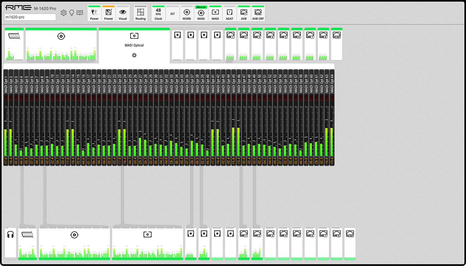 M-1620 Proは、2系統のMADI入出力(オプティカル / オプションのコアキシャル)、最大8ストリーム / 128チャンネル対応のMILAN準拠AVB入出力、4系統のADAT入出力を備えており、用途に応じた多様なフォーマットをサポートします。これにより、さまざまなオーディオ機器との接続に柔軟に対応可能です。すべてのデジタル入出力は自由にルーティングでき、AD/DA変換、デジタル・フォーマット変換、ルーターとして活用できます。