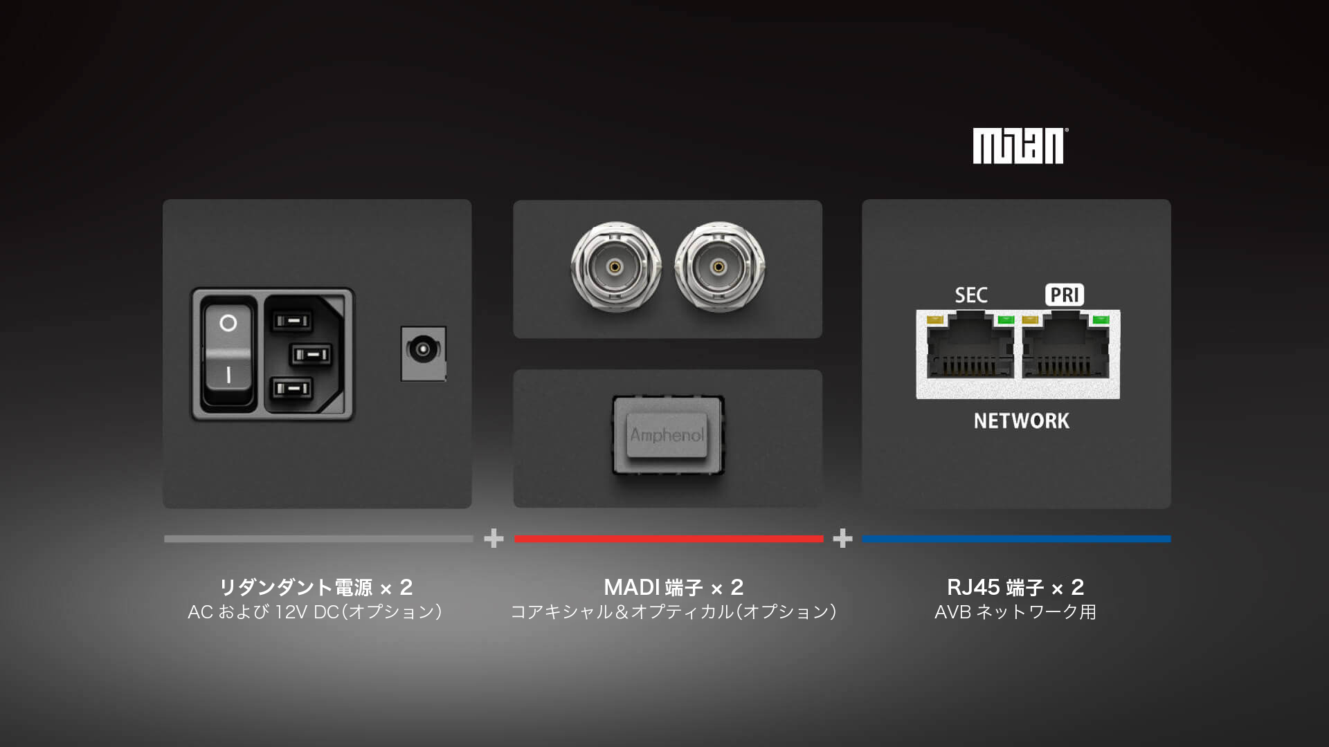 RJ45 ギガビット・イーサネット AVB/Milan × 2系統、双方向で8ストリーム(最大128チャンネル)、1 ~ 8 / 12 / 16ch、リダンダント仕様
